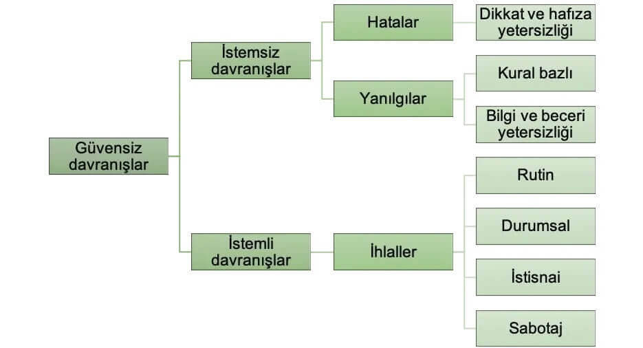 Yapılan araştırmalar güvensiz davranışların iki temel türü olduğunu ortaya koymaktadır. Bunlar istemli ve istemsiz davranışlardır.